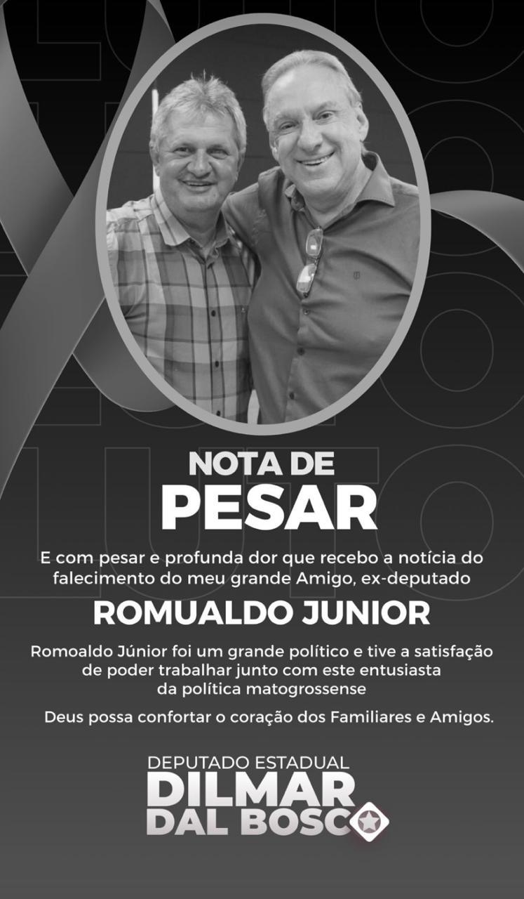 A secretária-geral do MDB, deputada Janaína Riva, lamentou a partida de Romoaldo, destacando sua dedicação à causa pública. "É com imenso pesar que recebi a notícia do falecimento do meu amigo e companheiro de partido, ex-deputado Romoaldo Junior. Romoaldo fez história na política de Mato Grosso, principalmente na defesa da população que vive na Região Norte do estado, e sua gentileza e carinho com todos ao seu redor deixarão imensas saudades", lamentou.