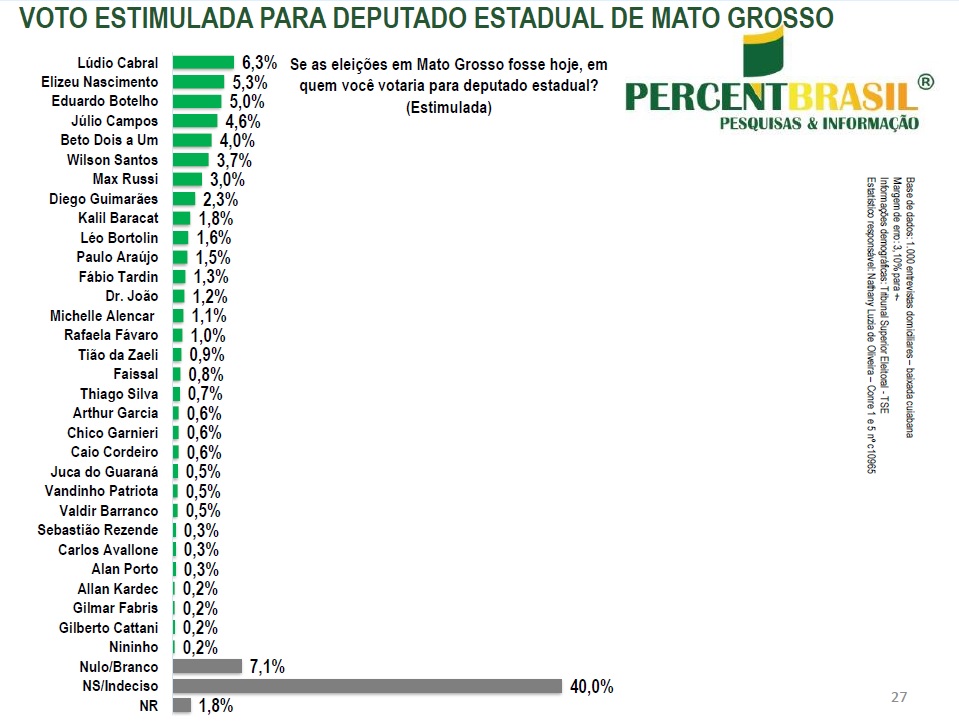 A pesquisa Percent Brasil divulgada nesta sexta-feira (28) pelo site Mídia News mostra o cenário atual da disputa por uma cadeira na Assembleia Legislativa de Mato Grosso entre eleitores da Baixada Cuiabana.