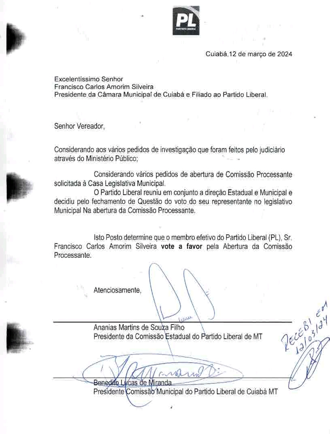 O presidente regional do Partido Liberal (PL), Ananias Filho, enviou uma determinação do partido favorável à abertura da Comissão Processante para a Câmara Municipal de Cuiabá, que pode levar à cassação do prefeito Emanuel Pinheiro (MDB). O documento instruía o presidente do Legislativo, Chico 2000, a seguir a diretriz do partido, caso fosse necessário votar. Chico apenas votaria em caso de empate entre os outros 24 vereadores. No entanto, o presidente do PL se viu dispensado dessa obrigação, pois 16 vereadores apoiaram a abertura da comissão, que investigará infrações político-administrativas cometidas por Emanuel Pinheiro.